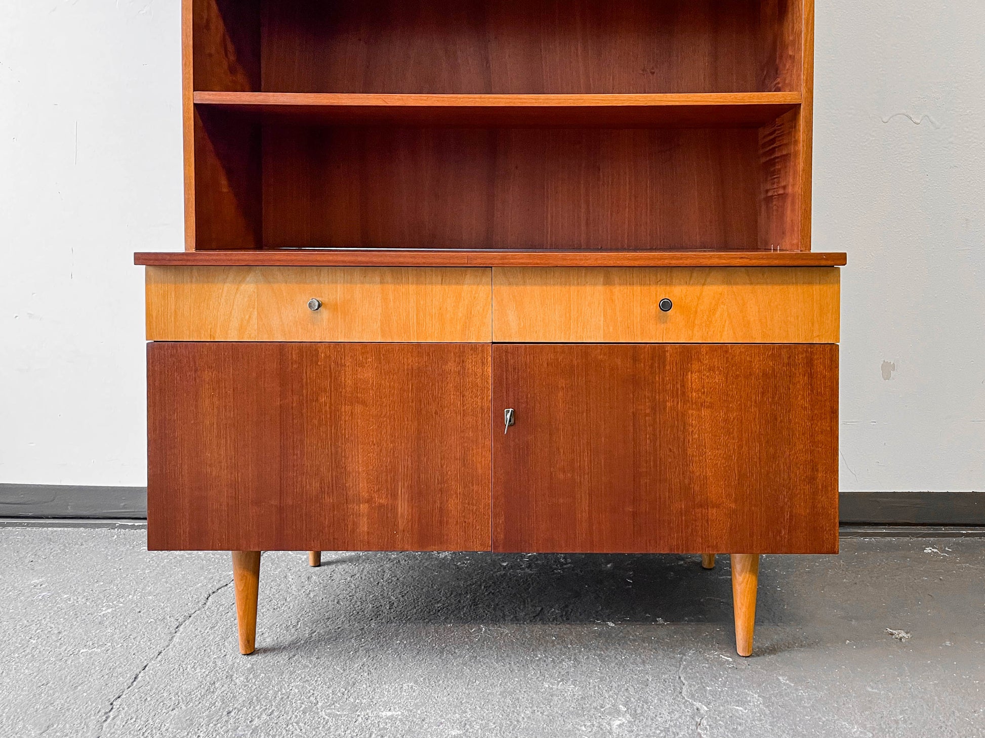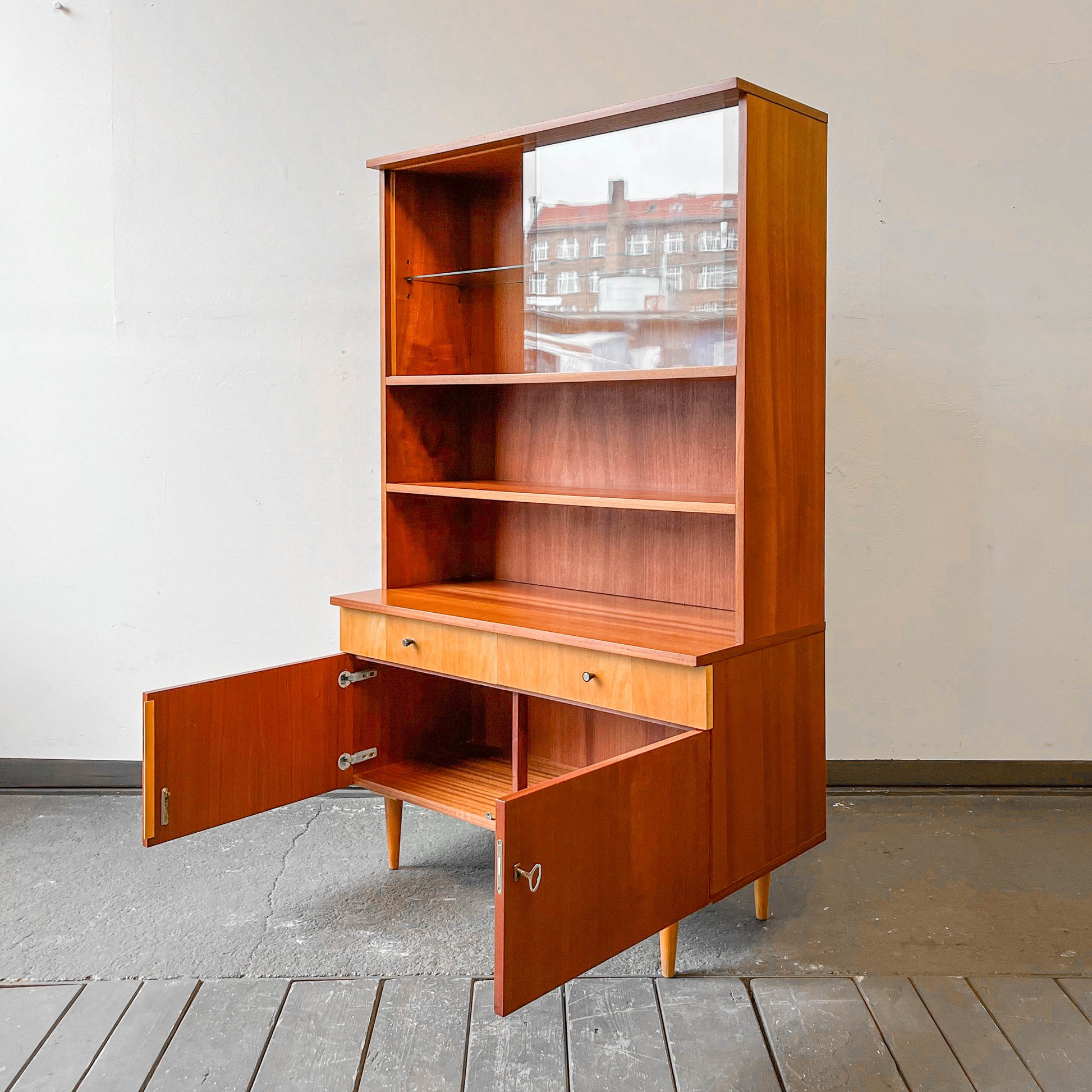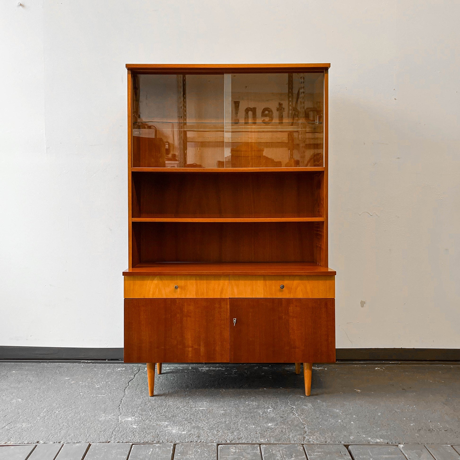 AUSSTATTUNG. halb geschlossenes halb offenes oberteil · zwei glasschiebetüren · zwei fachböden · zwei schubladen · unterteil zweitürig