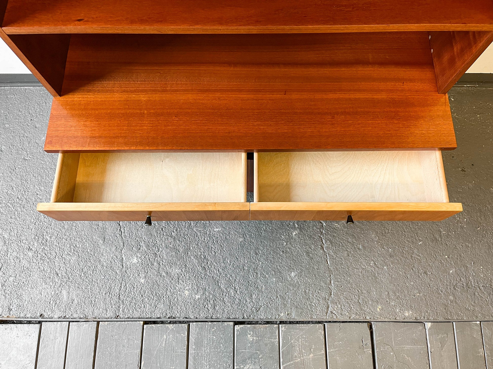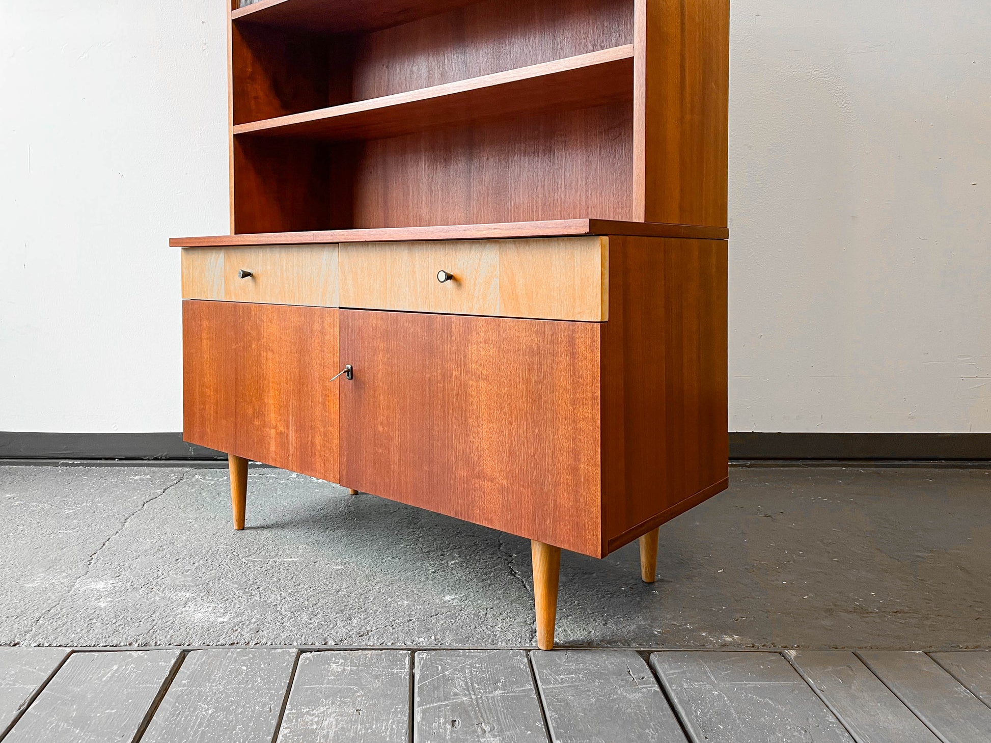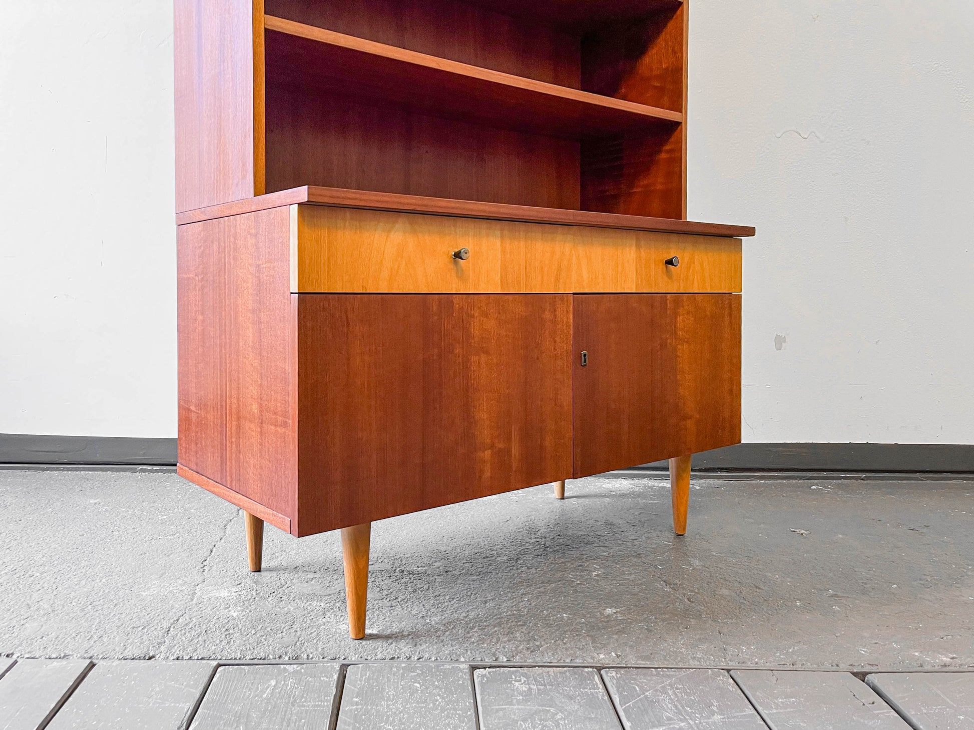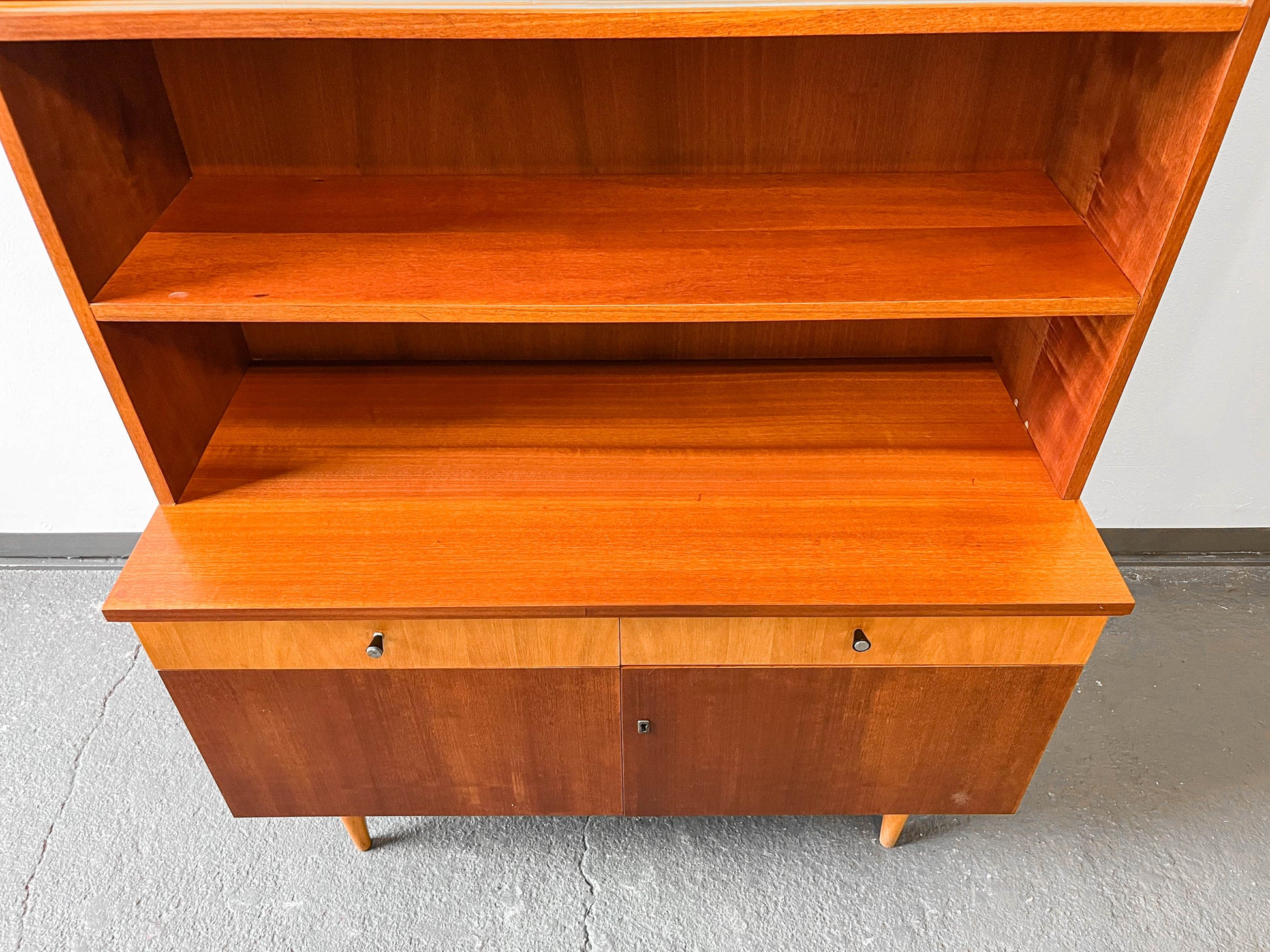 AUSSTATTUNG. halb geschlossenes halb offenes oberteil · zwei glasschiebetüren · zwei fachböden · zwei schubladen · unterteil zweitürig