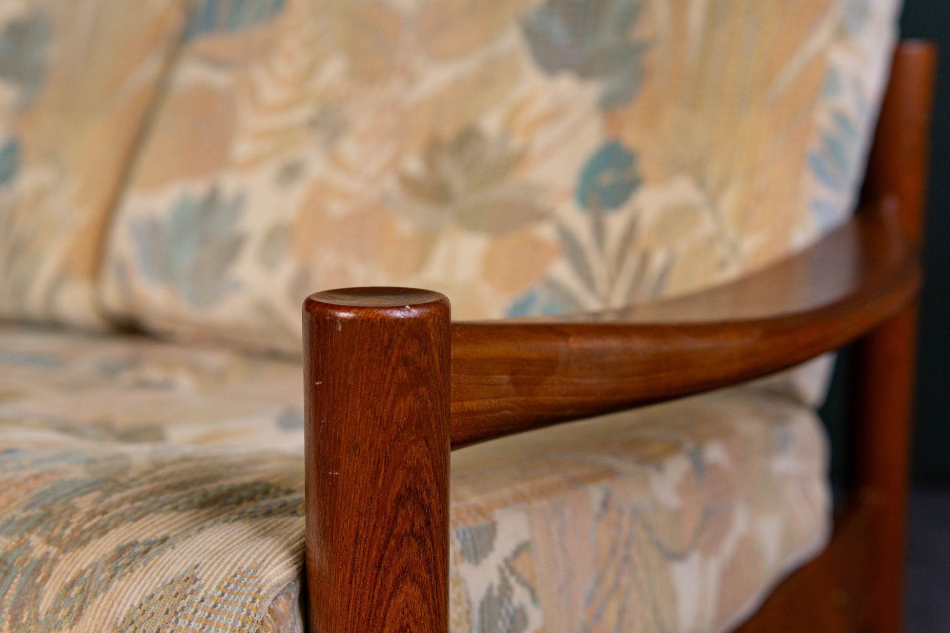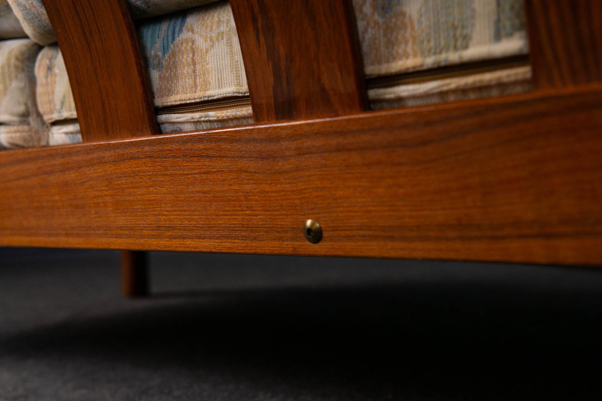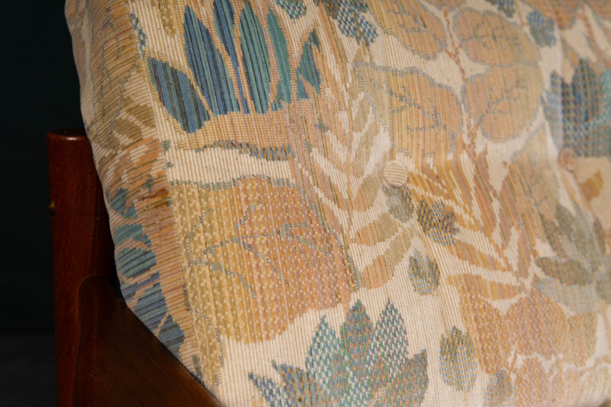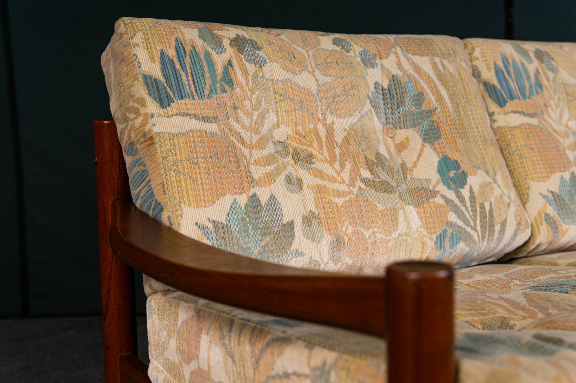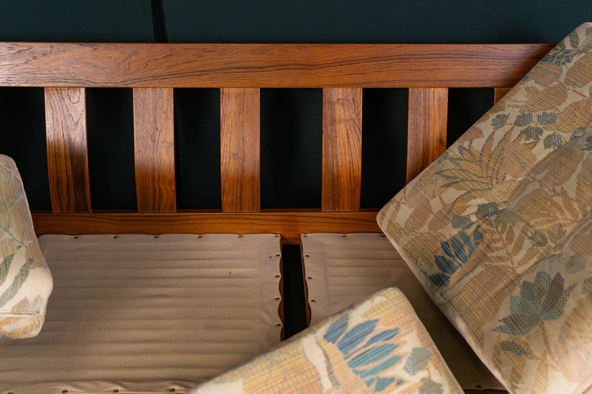 MATERIAL. teakholz · heller floraler stoffbezug · abziehbar