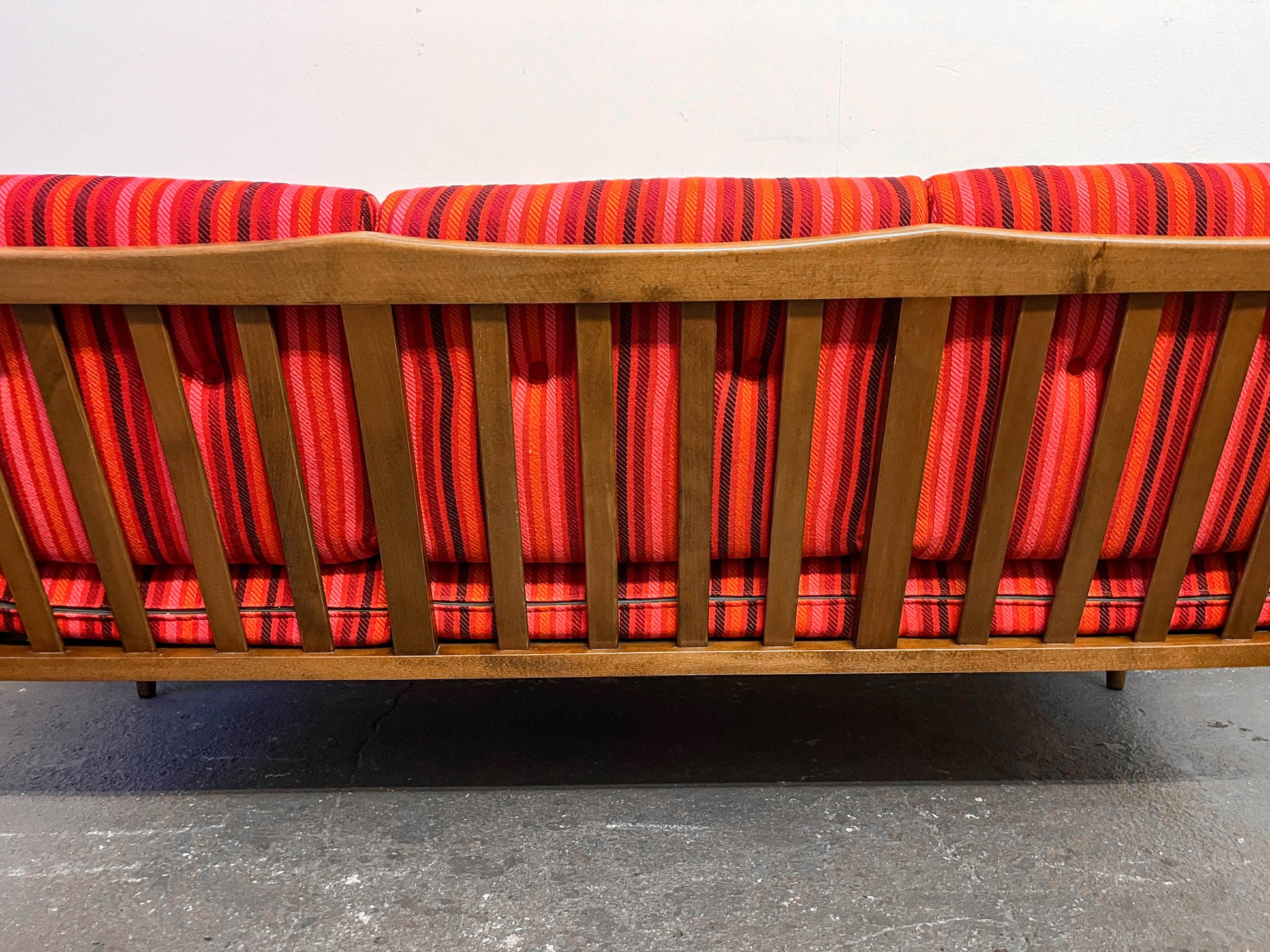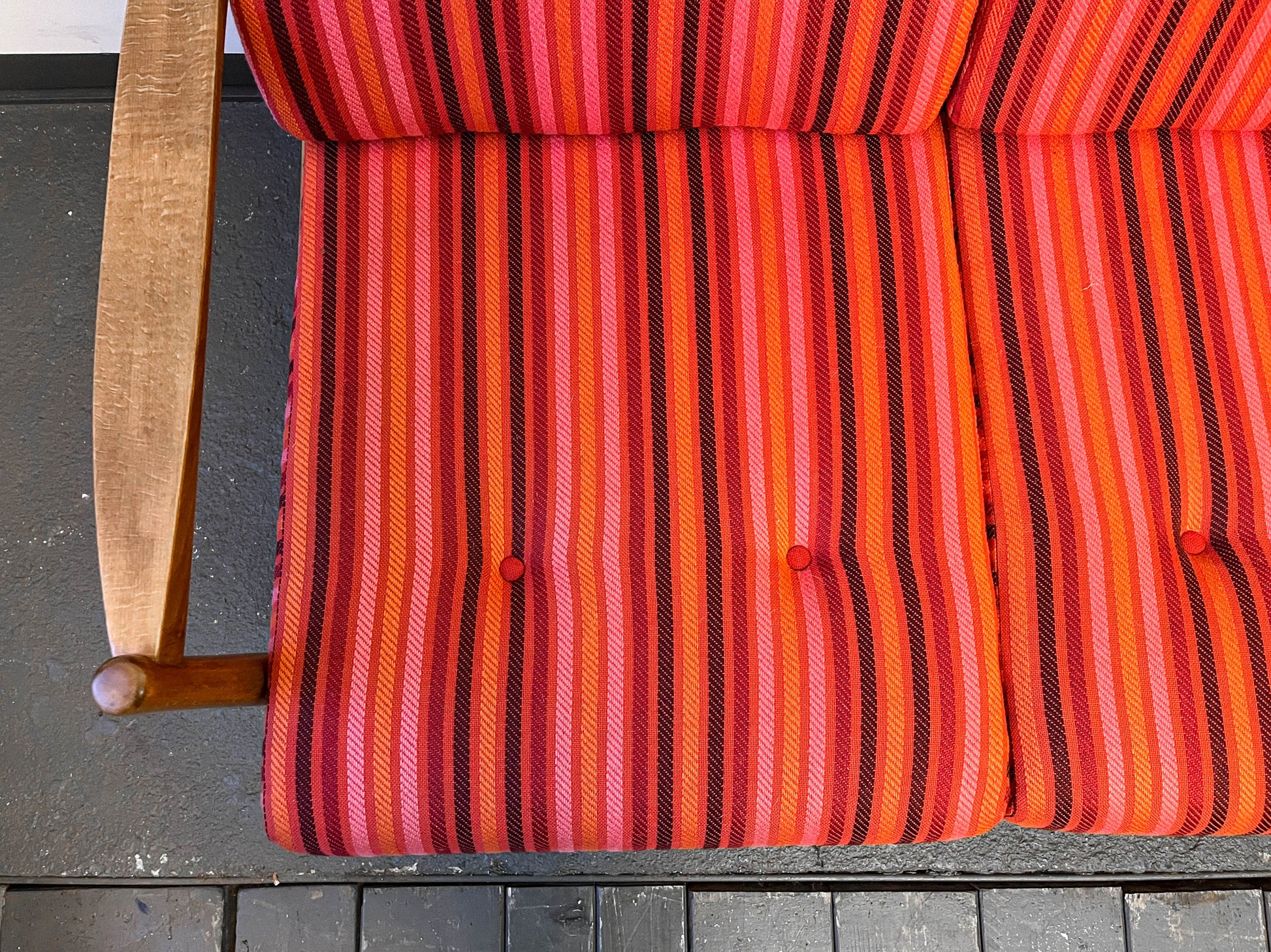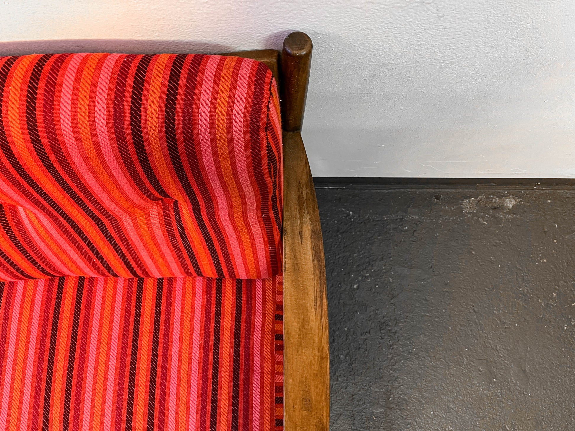 MATERIAL. in buche massiv · dunkel gebeizt · rot gestreifter bezugstoff · mit reisverschluss · polsterknöpfe
