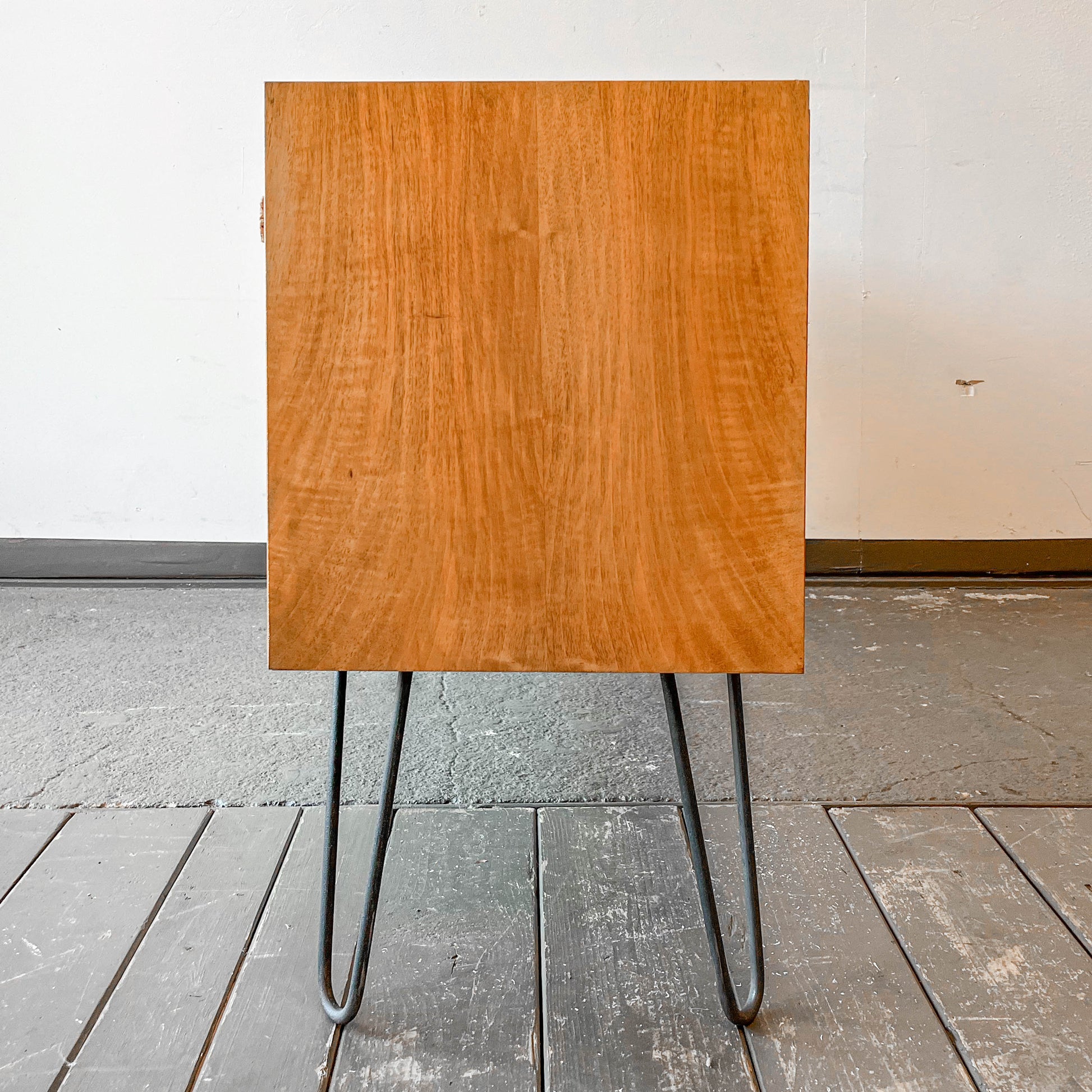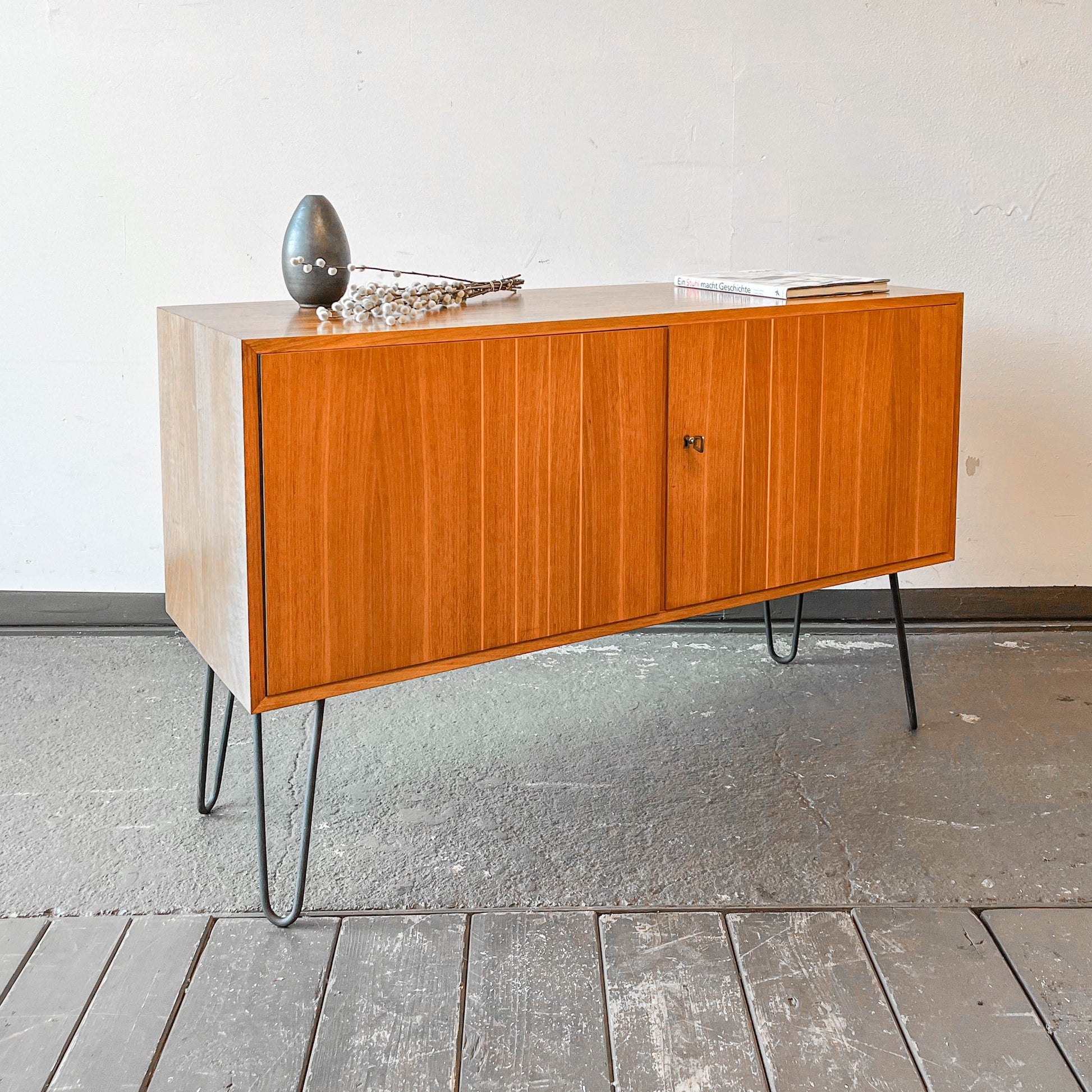 MATERIAL. nussbaum furniert · ausgewähltes furnier · innen mahagoni furniert · massive füße · hairpinlegs grau