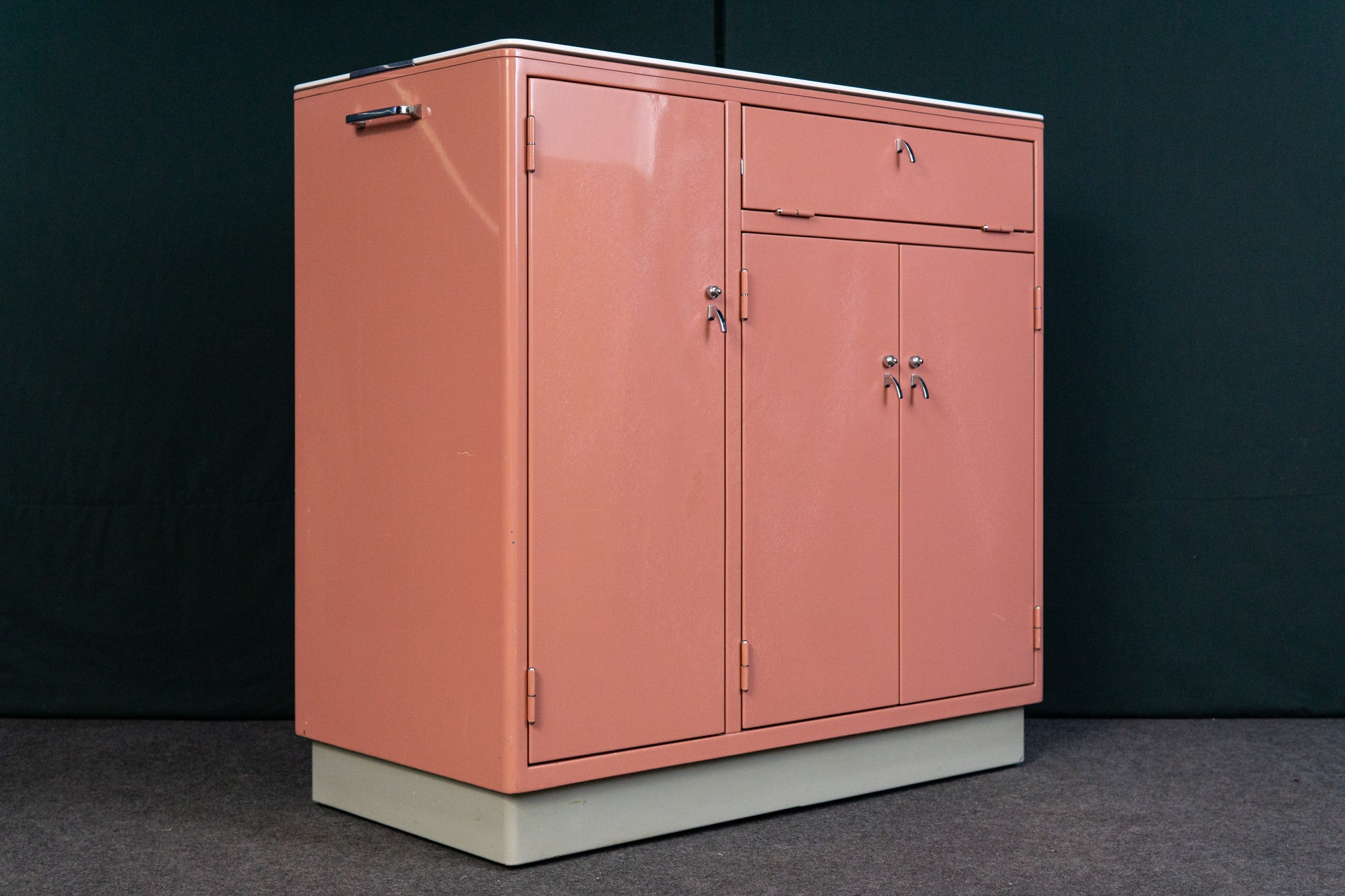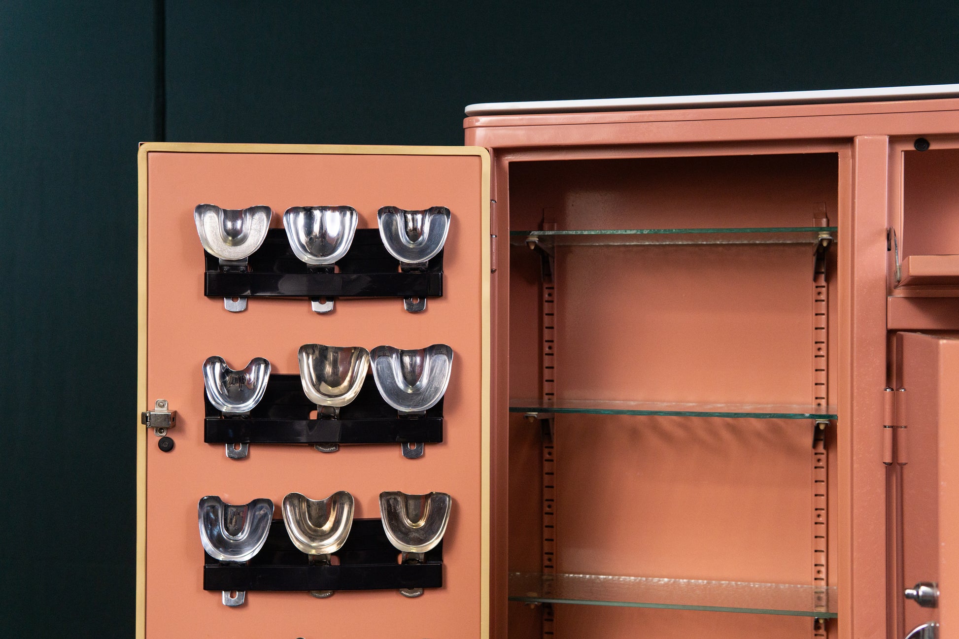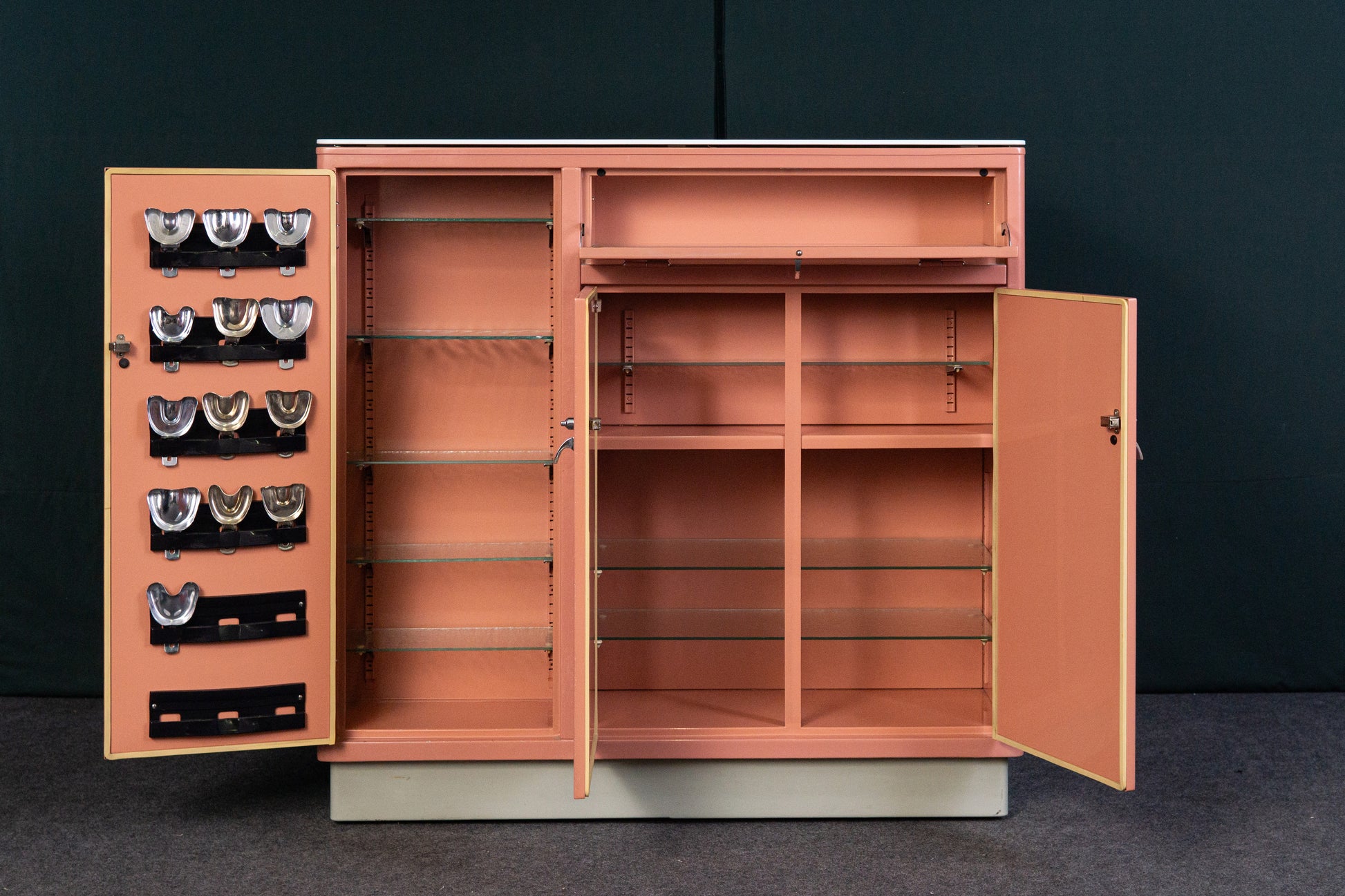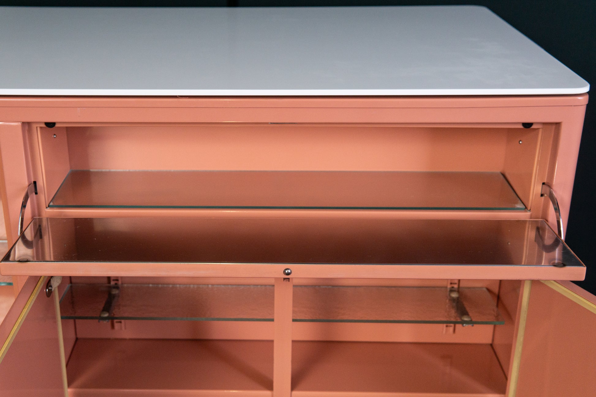 MATERIAL. metall lackiert in patelltönen blaugrau & rosa · weiße deckplatte · ornamentgläser