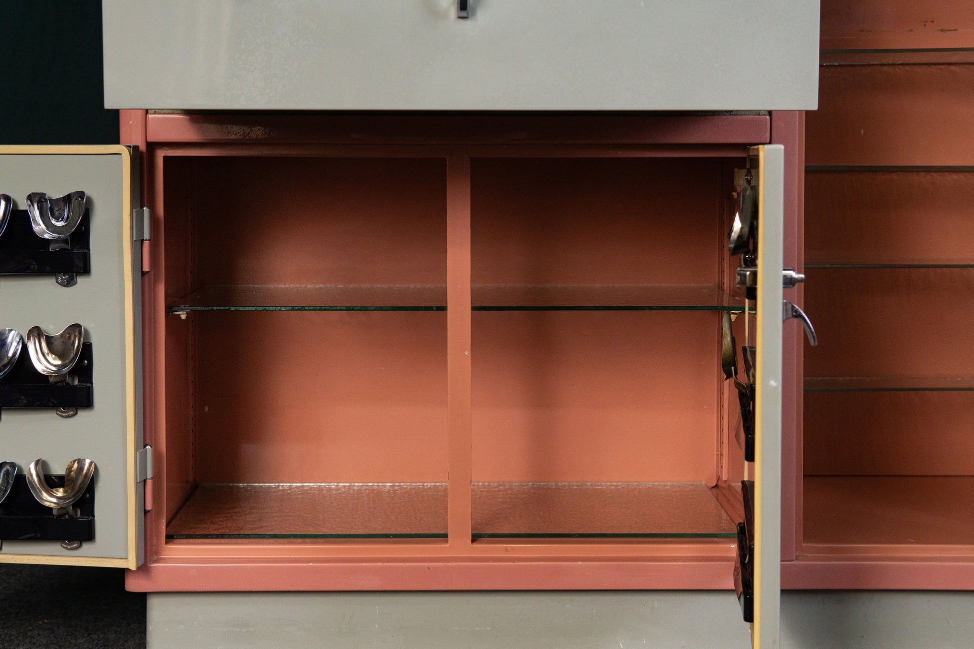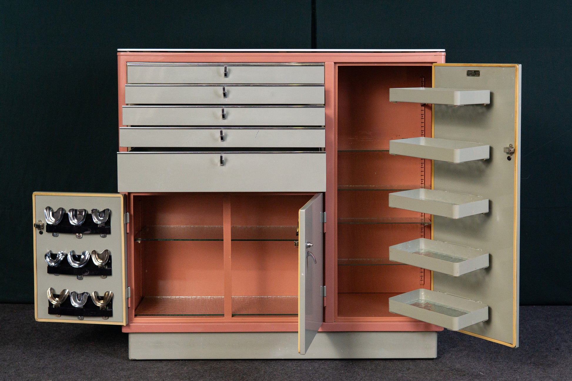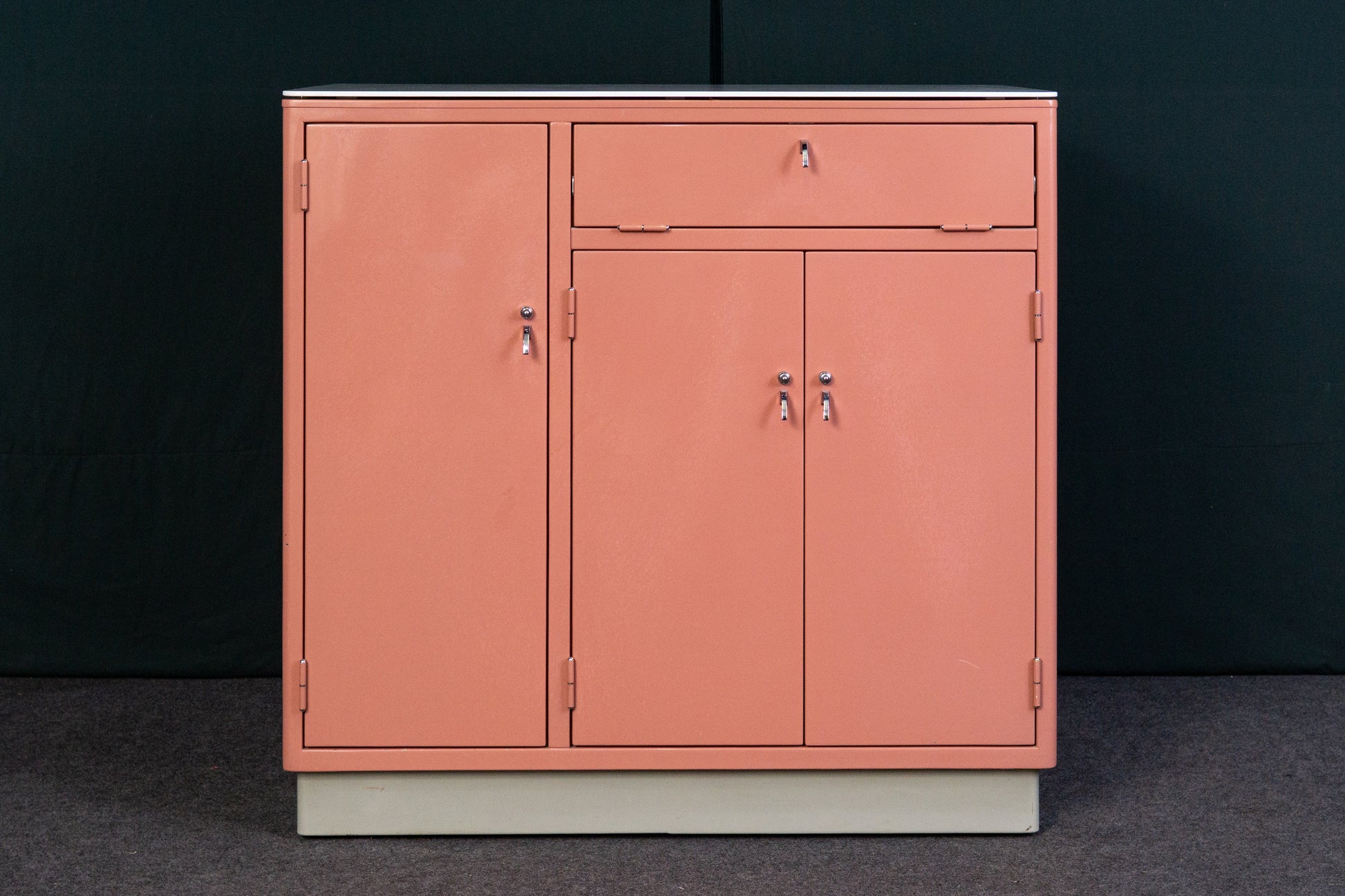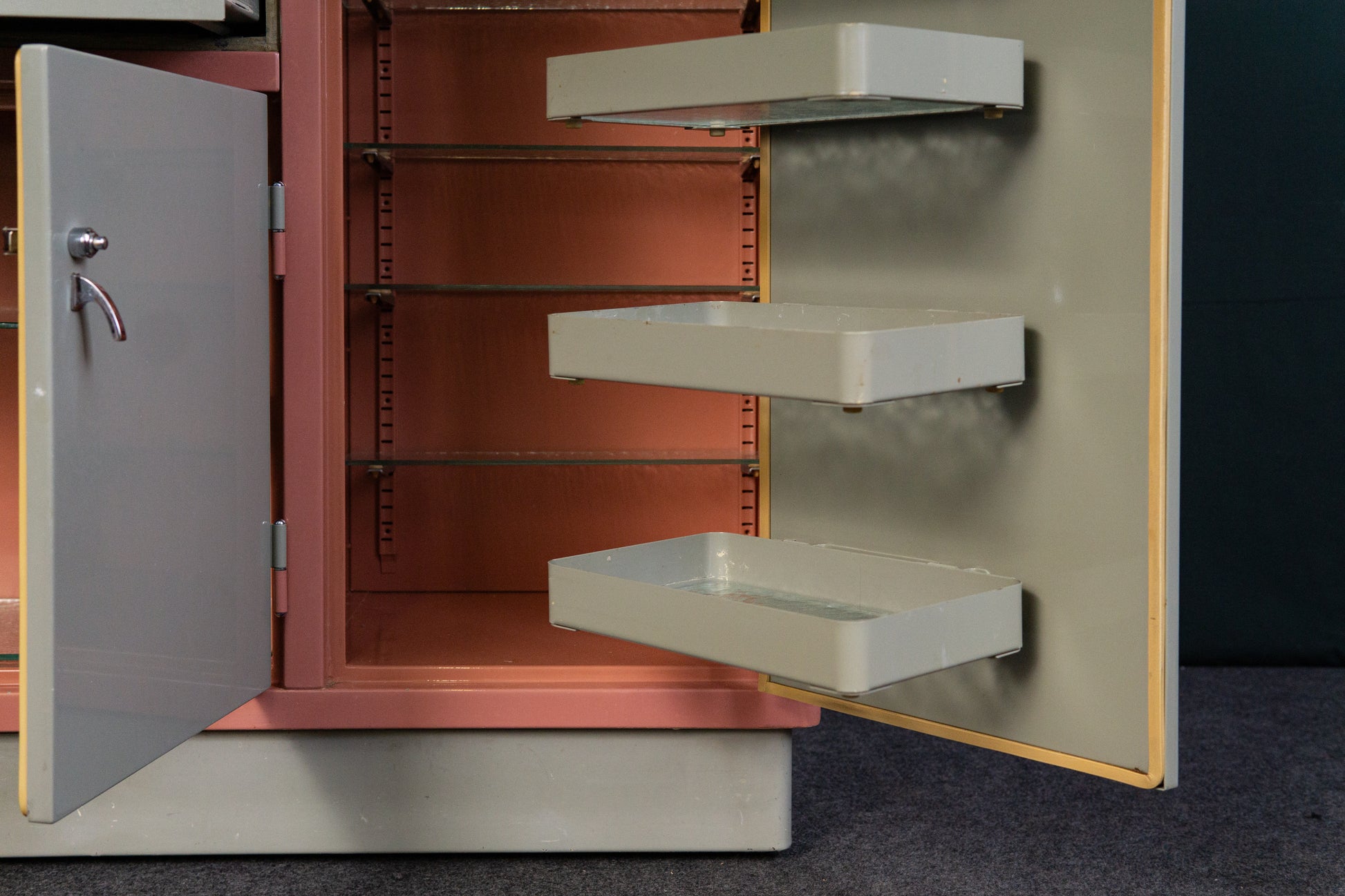 MATERIAL. metall lackiert in patelltönen blaugrau & rosa · weiße deckplatte · ornamentgläser