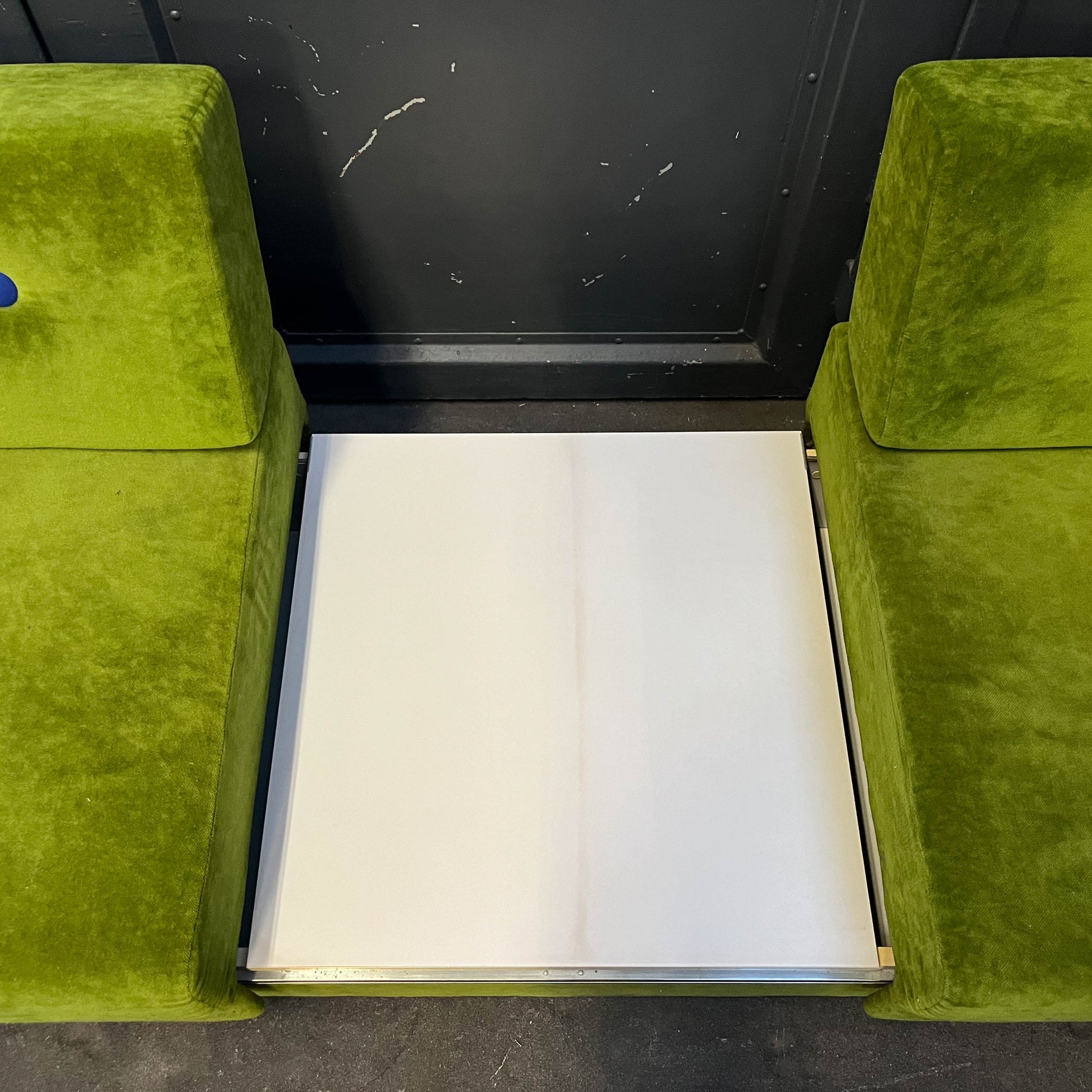 MATERIAL. grünfarbener bezugsstoff · chromgestell · tisch I bettkasten aus holzwerkstoff weiß